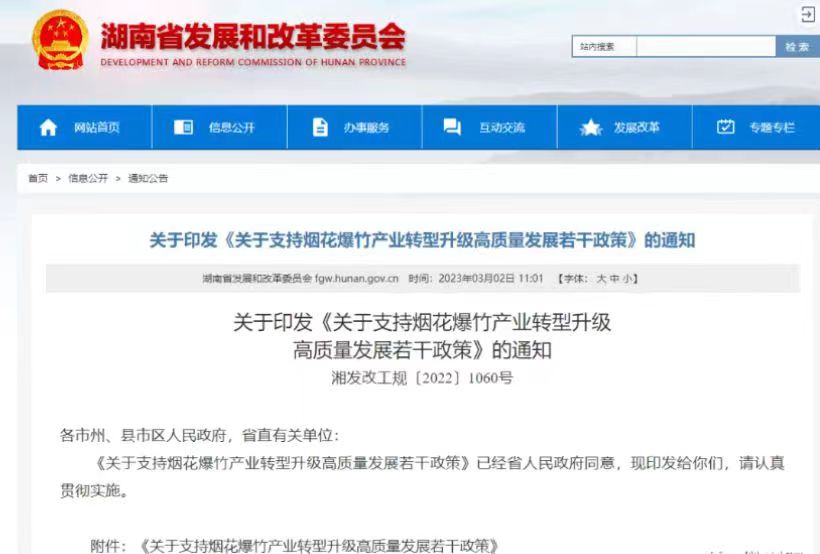 今天湖南省發(fā)改委官網(wǎng)公布關(guān)于印發(fā)《關(guān)于支持煙花爆竹產(chǎn)業(yè)轉(zhuǎn)型升級高質(zhì)量發(fā)展若干政策》的通知具體內(nèi)容如下: